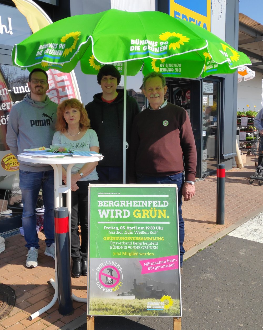 Bereits vor Gründung können die Bergrheinfelder Grünen mit einer ersten Aktion aufwerten. In einem Bürgerantrag mit dem Namen „Wir haben’s glyphosatt!“ fordern sie ein Verbot von glyphosathaltigen Mitteln auf von der Gemeinde verpachteten Flächen. Letztes Wochenende veranstalteten die Grünen dazu einen Infostand in Bergrheinfeld und haben laut eigenen Aussagen bereits die notwendigen 1% Unterschriften der Bergrheinfelder BürgerInnen gesammelt, um den Antrag einzureichen. Neben dem Kreisvorsitzenden war auch das wohl berühmteste Mitglied des zu gründenden Bergrheinfelder Ortsverbands bei der Aktion anwesend: Der Landtagsabgeordnete Paul Knoblach. „Glyphosat schadet nachweislich unserer Umwelt und Gesundheit. Ich rufe alle Bergrheinfelder auf sich am Bürgerantrag zu beteiligen, um starkes Signal an den Gemeinderat zu senden.“ – so das Landtagsmitglied. Beteiligen können sich weitere die Bürgerinnen und Bürger mit einer Unterschrift während der Gründungsversammlung.