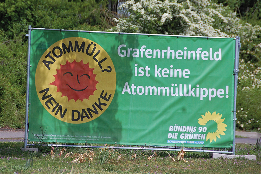 Wegen der Pläne des Energiekonzerns PreussenElektra, radioaktiv strahlendes Material aus dem im Rückbau befindlichen Atomkraftwerk Würgassen ins Zwischenlager nach Grafenrheinfeld zu transportieren, gibt es aktuell massiven Widerstand. Unter dem Slogan „Grafenrheinfeld ist keine Atommüllkippe!“ stemmen sich auf Initiative der Grünen mittlerweile etliche Landkreisgemeinden in Resolutionen und auf Plakaten gegen das Vorhaben. Die Protestbanner stehen an vielen Ortsausgängen von zahlreichen Gemeinden und der Stadt Schweinfurt.