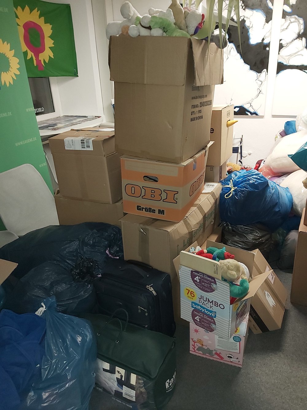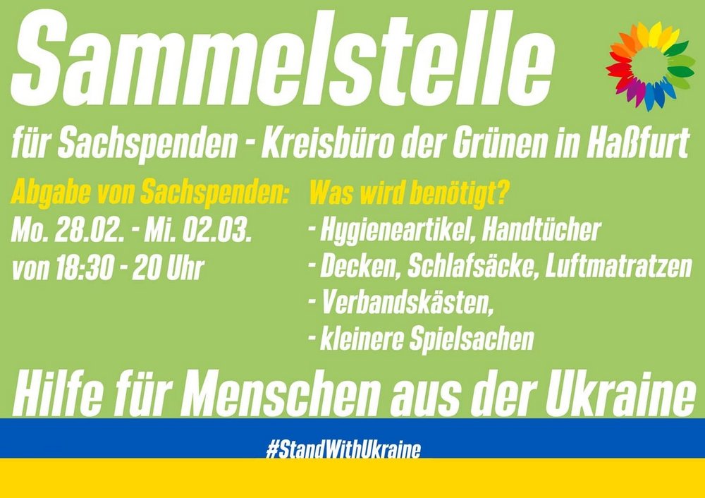 Der Ortsverband Grüne Haßfurt organisiert zusammen mit der Firma Stappenbacher einen Hilfstransport für Menschen in der Ukraine für Freitag den 4.3.2022. Inzwischen kommen Spenden für diesen Hilfstransport aus ganz Unterfranken von Zellingen über Schweinfurt bis nach Haßfurt. Viele auch ukrainische und russische Mitbürger haben dafür gespendet. Wir sagen Danke.