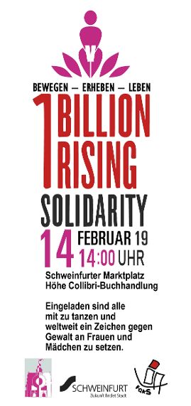 | jede 3. Frau weltweit war bereits Opfer von Gewalt, wurde geschlagen, zu sexuellem Kontakt gezwungen, vergewaltigt oder in anderer Form misshandelt. Jede 3. Frau, das sind eine Milliarde Frauen (one billion), denen Gewalt angetan wird - ein unfassbares Gräuel. Am 14. Februar sind eine Milliarde Frauen dazu eingeladen, raus zu gehen, zu tanzen und sich zu erheben, um das Ende dieser Gewalt zu fordern. Eine Milliarde Frauen – und Männer – überall auf der Welt. Wir zeigen der Welt unsere kollektive Stärke und unsere globale Solidarität über alle Grenzen hinweg. Zeig auch Du der Welt am 14. Februar, wie EINE MILLIARDE aussieht. In Schweinfurt wird sich am 14.02. um 14:00 Uhr auf dem Marktplatz (Höhe Buchhandlung Colobri) getroffen um auch hier ein Zeichen zu setzen. Anbei der Flyer der Aktion - weiter Infos findet ihr unter http://www.onebillionrising.de/ Eine wirklich unterstützenswerte Aktion! Viele Grüße, Johannes Weiß |
