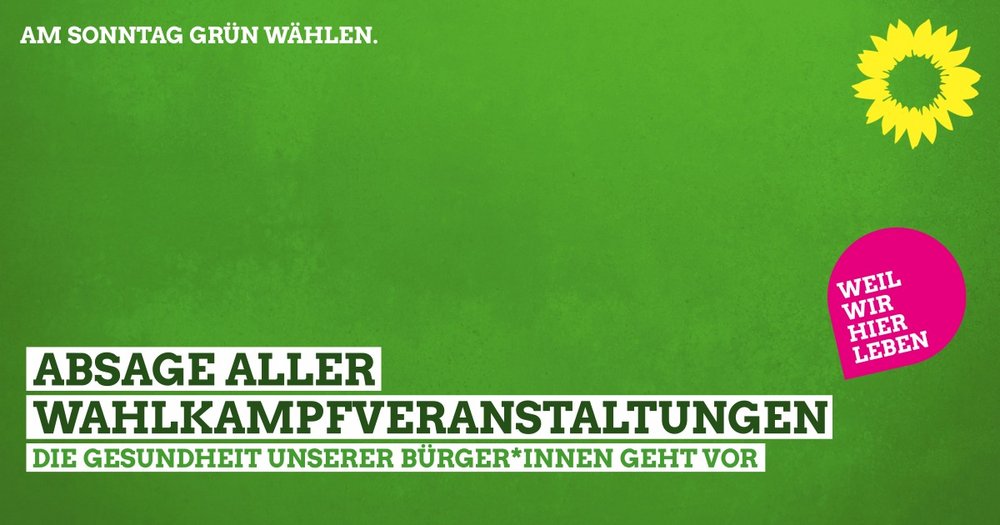 Aus „Verantwortung für die Gesundheit der Menschen in unserer Region“ und laut den Empfehlungen der Gesundheitsbehörden, sagt die Partei BÜNDNIS 90/DIE GRÜNEN alle öffentlichen Wahlkampfveranstaltungen in Stadt und Landkreis Schweinfurt ab.