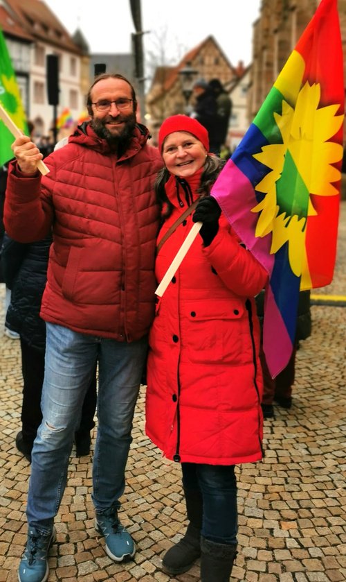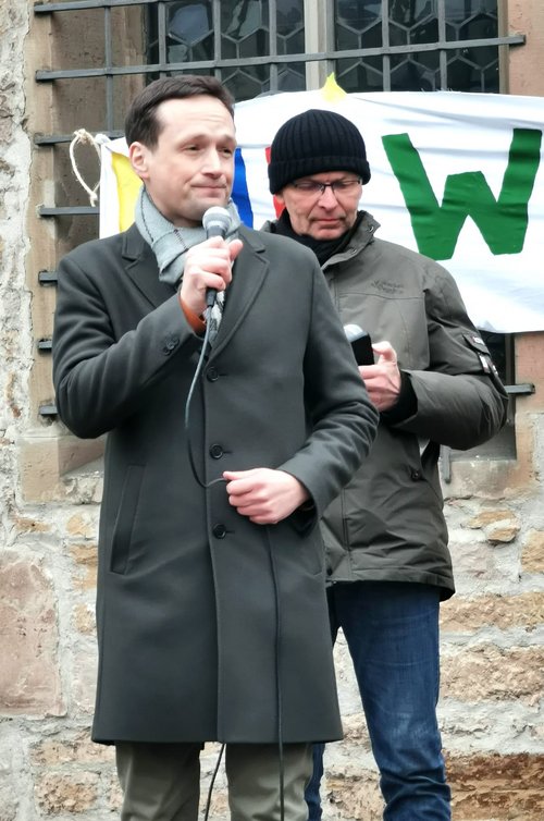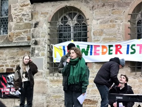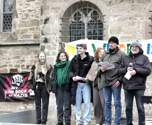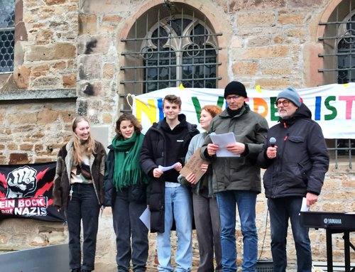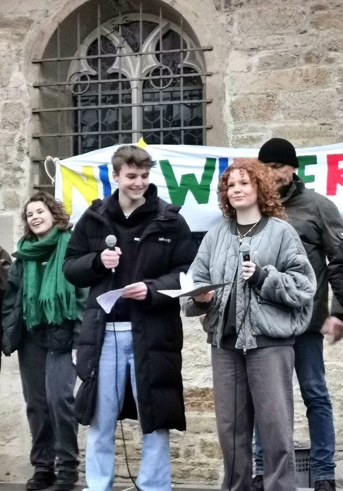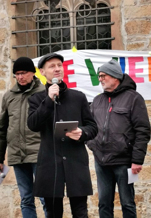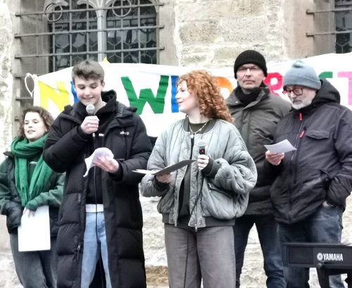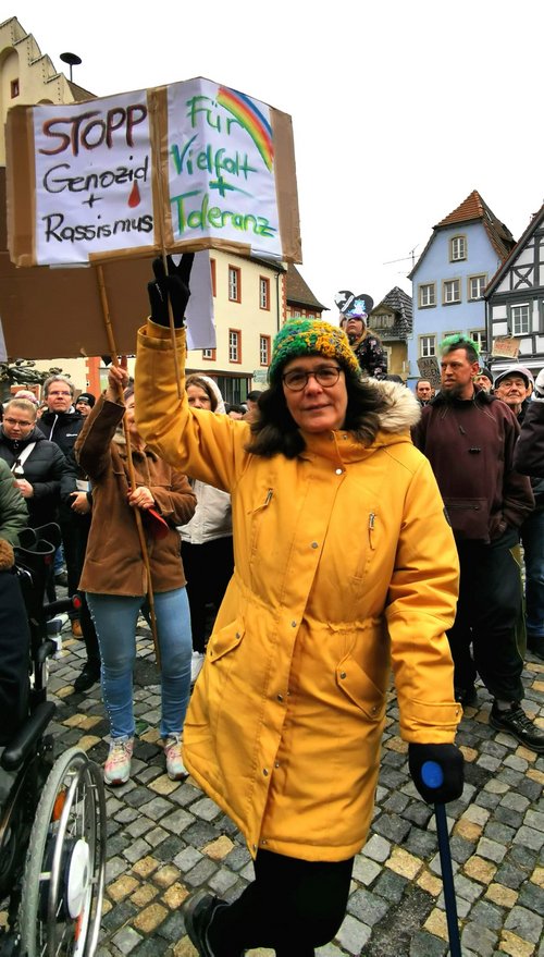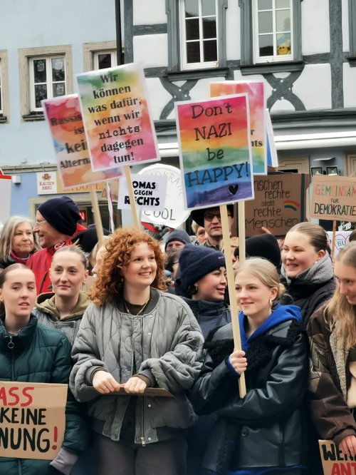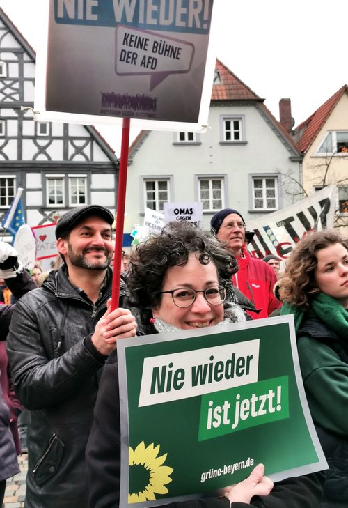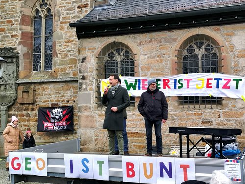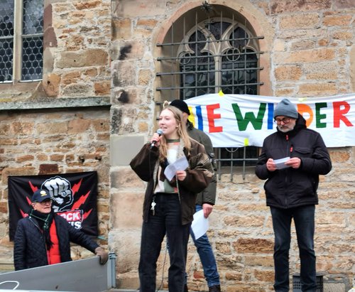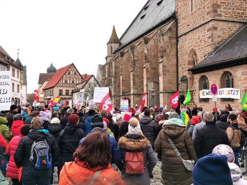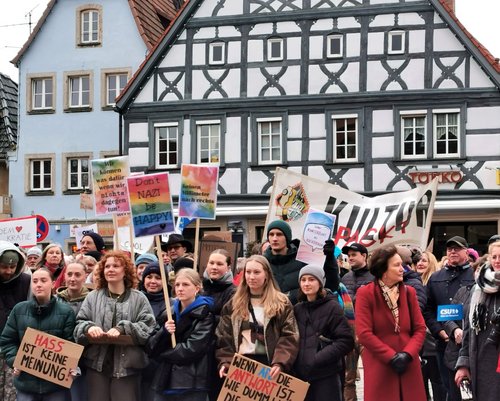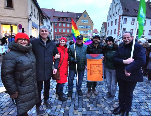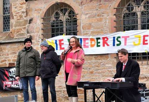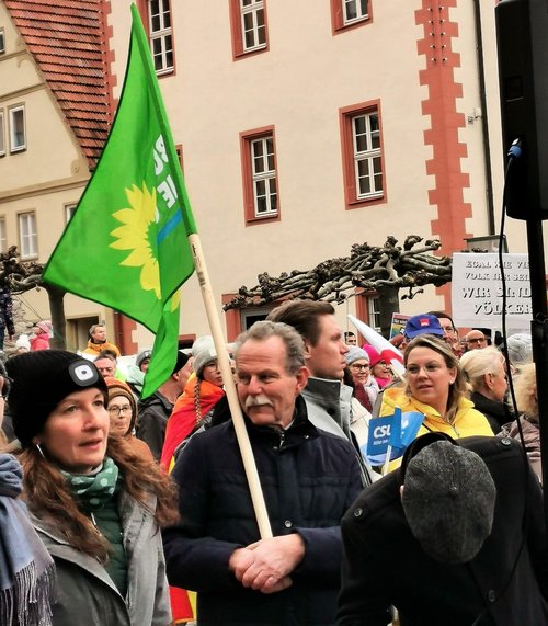 In kürzester Zeit haben es verschiedene ehrenamtlich vernetzte Persönlichkeiten in Gerolzhofen geschafft eine Demo "Gegen Rechts" zu initiieren. Am heutigen Samstag kam in der "bunte" Kleinstadt ca. 600 Personen zusammen um ein Zeichen für Demokratie und Fremdenfeindlichkeit zu setzen. Ein hochkarätiges Rahmenprogramm mit musikalischen Beiträgen des Duos "Café Sehnsucht" mit Silvia Kirchhof und Achim Hofmann, sowie Poetryslams von Nele Wirth und Ayla Zietlow bereicherten die Veranstaltung.