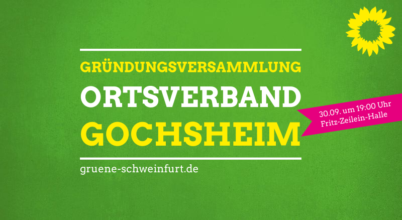 Bündnis 90/Die Grünen gründen laut Pressemitteilung den nächsten Ortsverband im Landkreis Schweinfurt. Der mittlerweile dritte Ortsverband innerhalb eines Jahres soll am Montag, 30.09.2019 um 19:00 Uhr in der Fritz-Zeilein-Halle (Friedhofstr. 13) in Gochsheim entstehen. Aufgrund der großen Welle der Zustimmung in den letzten Monaten können die Bündnisgrünen bis dahin über 50 Ortsverbände in Unterfranken vorweisen.
