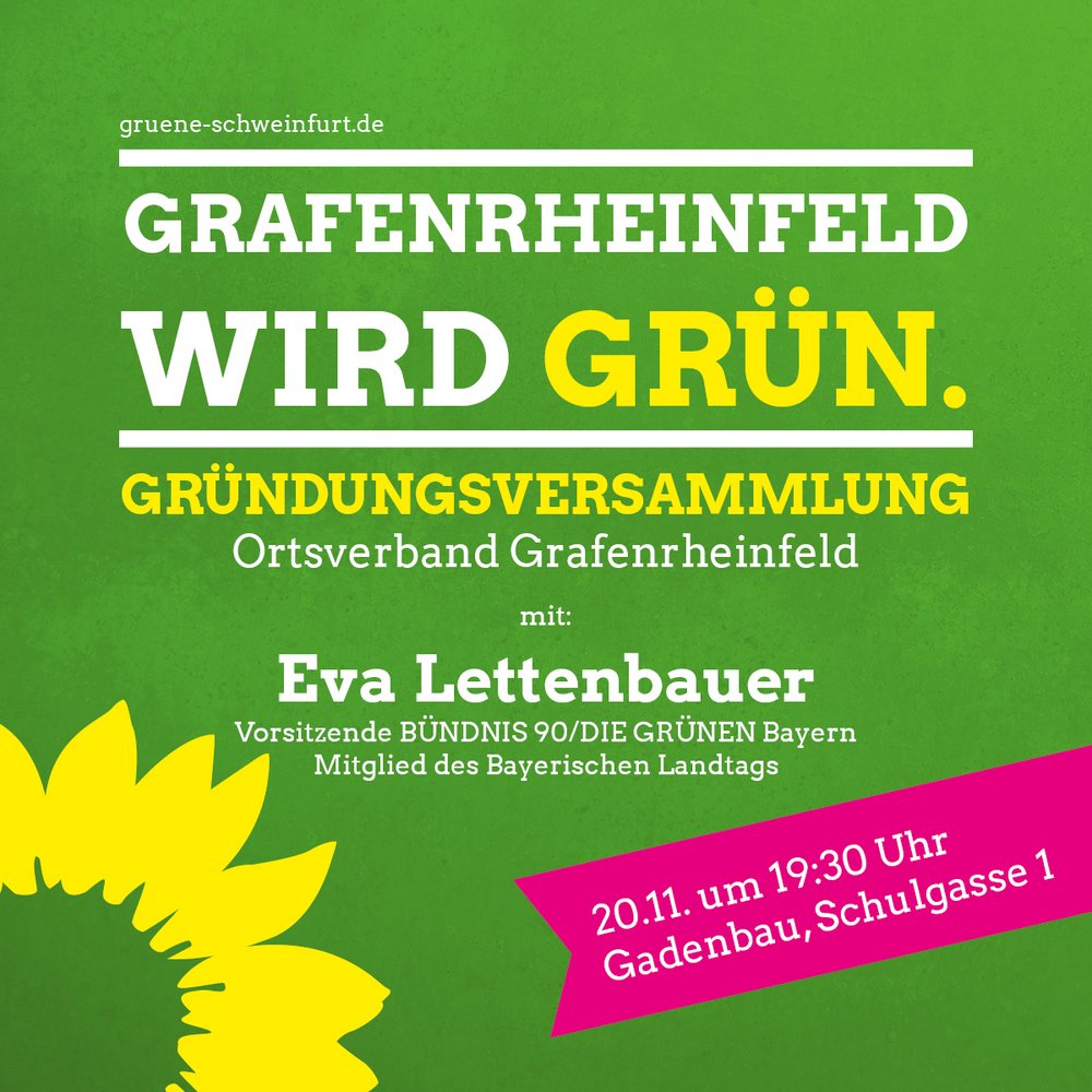 Am Mittwoch, 20. November um 19:30 Uhr gründen BÜNDNIS 90/DIE GRÜNEN im Gadenbau (Schulgasse 1, Grafenrheinfeld) ihren nächsten Ortsverband im Landkreis Schweinfurt. Zur Gründung des mittlerweile vierten neuen Ortsverbands der Grünen innerhalb eines Jahres reist eigens die Landesvorsitzende und Mitglied des Bayerischen Landtags, Eva Lettenbauer, an.
