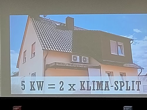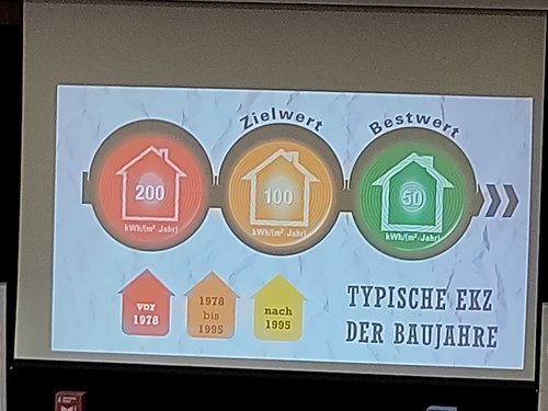 Dann kam Carsten Herbert und erklärte genauso niederschwellig wie in seinen Youtoube Videos, wie er dazu kam diese Videos zum Klimakomisar zu machen. Danach führte er die Zuhörerschaft in einfachen Zahlen in ein Ampelsystem Grün, Gelb und Rot ein, wie man Häuser anhand ihres Energieverbrauchs pro Fläche und Jahr einordnet. Darauf aufbauend ordnete er diese Häuser dann ein, inwieweit sie sich für Wärmepumpen gut, weniger gut oder so nicht für Wärmepumpen eignen.