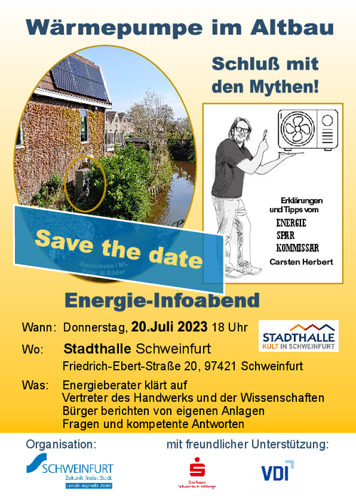 Am 20.07. war die Stadthalle Schweinfurt fast bis zum letzten Platz gefüllt. Der Balkon im ersten Stock musste genutzt werden um den Interessierten Platz für das Thema Wärmepumpen im Altbau zu geben. Die lokale Agenda 2030 Schweinfurt hatte den Energieberater Carsten Herbert, alias "Energie Spar Kommissar" auf Youtube eingeladen zu dem derzeit am häufigsten und umstrittensten Thema der Republik zu besprechen: Wie heizen wir in Zukunft in unserem privaten Haus?
